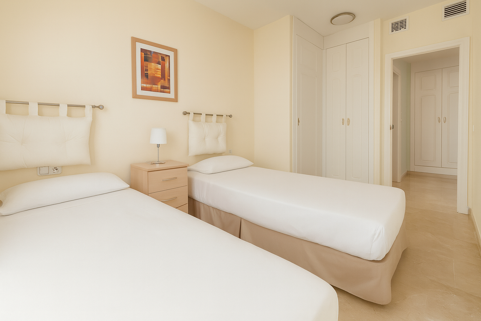 • Bedrooms: Two generous double bedrooms with fitted wardrobes. The main bedroom includes an ensuite bathroom and pool views. A stylish family bathroom serves the second bedroom.