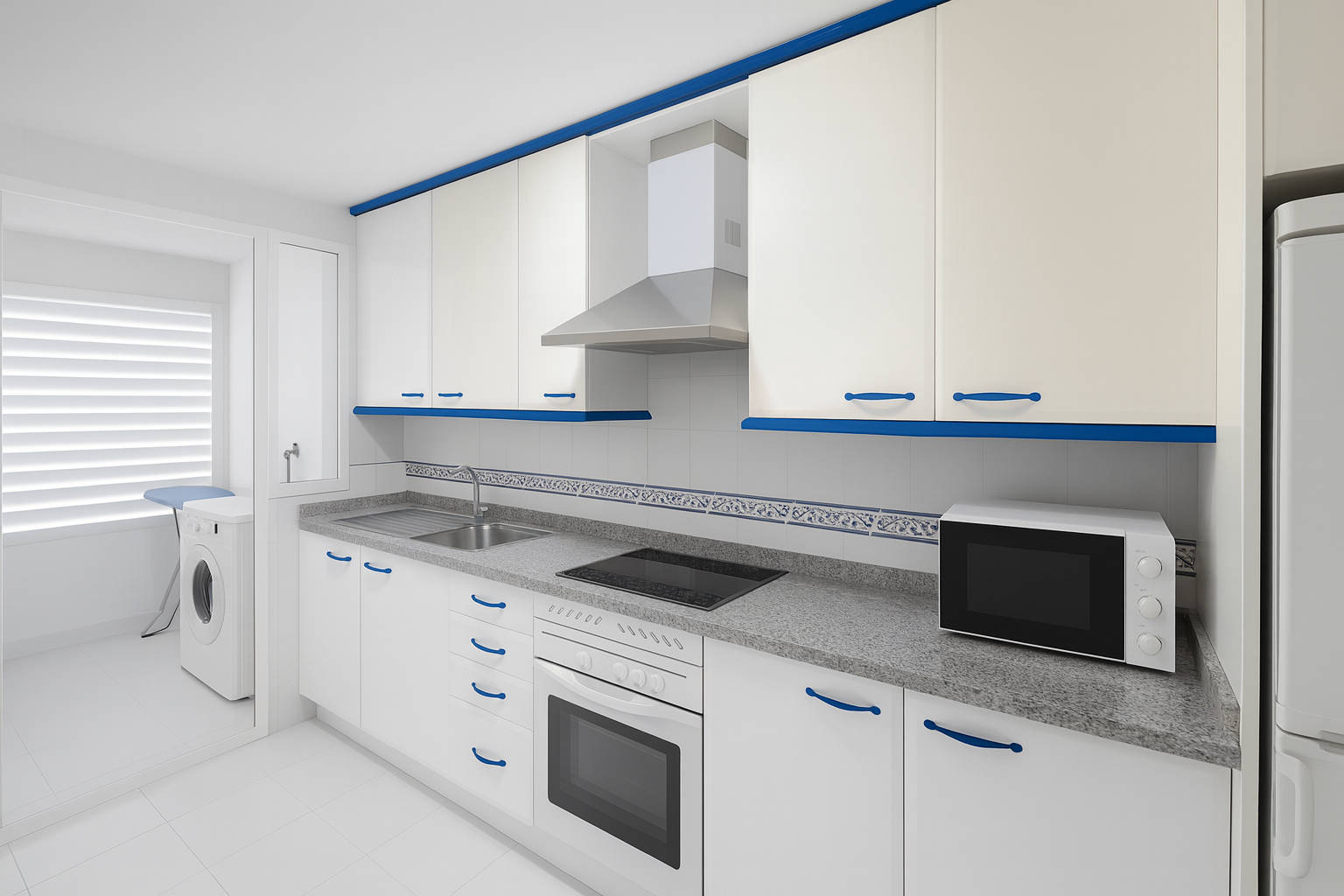 • Spacious Living: Entrance hall leads to a guest bathroom and a fully fitted kitchen with separate utility room. The open-plan living and dining area is bright and welcoming, with French doors opening onto the terrace.